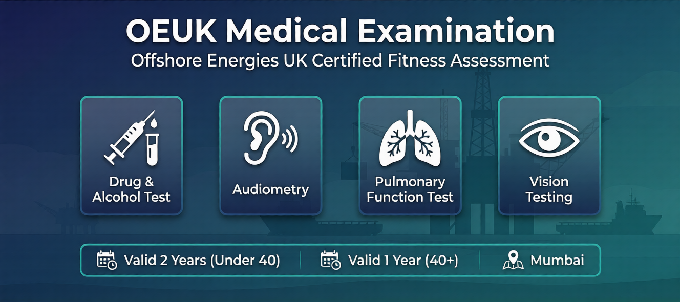 OEUK Medical Examination is much more than a control box; it is a multi-layered health assessment program that protects offshore workers, their peers, and the health of the energy business operations in the world. Including a Drug and Alcohol Test, Audiometry, Pulmonary Function Test (PFT) and Vision Testing, the assessment will make sure that all people sent out to the sea are fully fit to deal with all the physical, sensory and physiological challenges of the job.